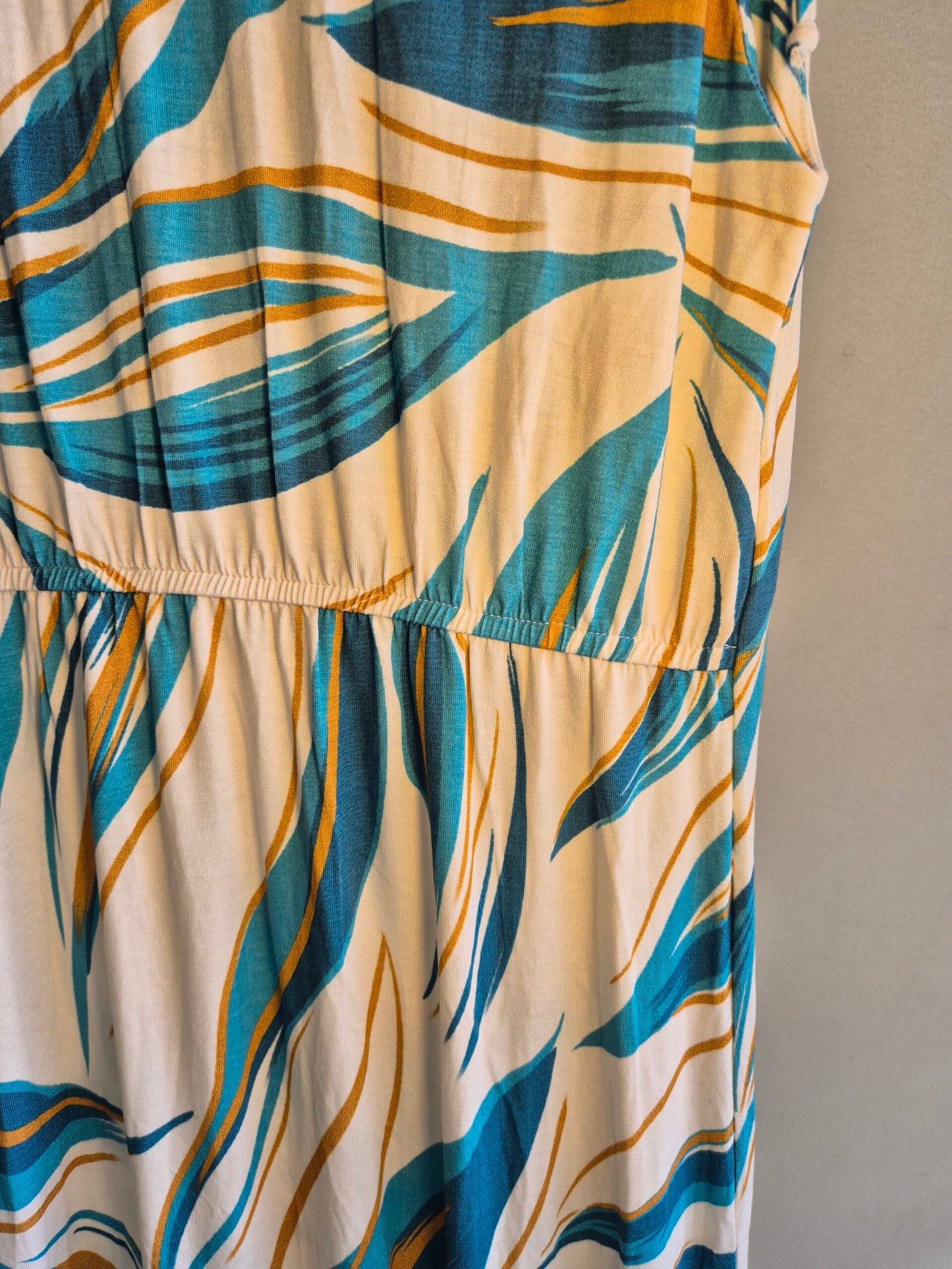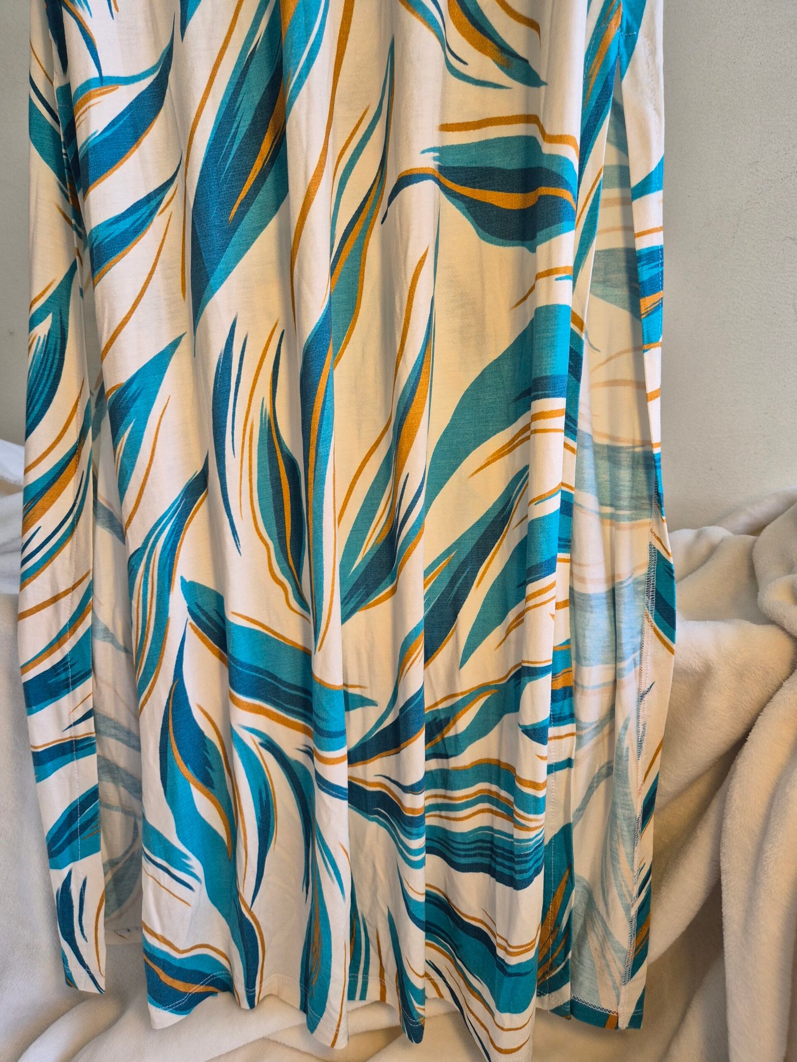 Vestido branco estampado em tons de azul e marrom, com design moderno e fenda que adiciona movimento e sofisticação à peça, ideal para compor looks leves e cheios de estilo.